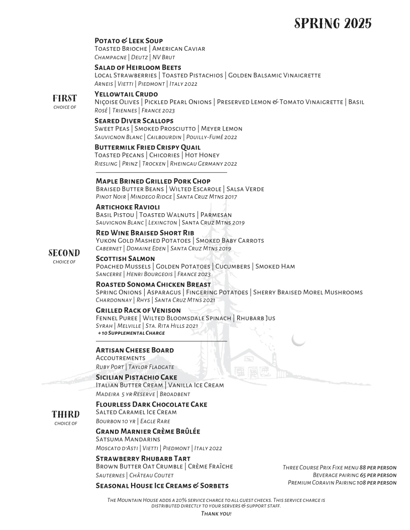 The menu showcases a delightful array of dishes that marry traditional American flavors with modern finesse. Start your meal with the Potato & Leek Soup served with toasted brioche, or indulge in the vibrant Salad of Heirloom Beets complemented by local strawberries, golden balsamic vinaigrette, and crunchy toasted pistachios. For the main course, the Seared Diver Scallops with sweet peas and smoked prosciutto is an absolute must-try. Each bite delivers a symphony of flavors that dance on the palate, while options like the Red Wine Braised Short Rib and the Artichoke Ravioli highlight the kitchen's commitment to ingredient quality and culinary craft.